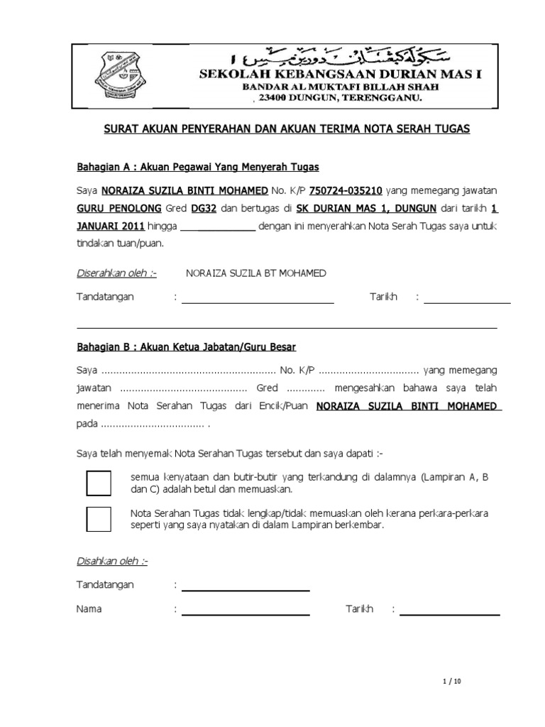 Contoh Nota Serah Tugas Perlu Diisi Untuk Guru Yang Berpindah Keluar from imgv2-2-f.scribdassets.com Baca surat taha lengkap bacaan arab, latin & terjemah indonesia. Surat peyerahan dan akuan terima i. Draf surat keputusan penunjukan kepala kantor cabang wilayah. Contoh surat tugas dalam artikel ini diantaranya adalah surat tugas organsisasi, surat 1. Ini adalah aplikasi untuk membuat permohonan surat tugas secara online. Surat rasmi serah tugas rasmi v : Draf surat keputusan penugasan karyawan (surat tugas). Surat serahan tugas nota serah tugas.borang kutipan dan serahan guru ke pejabat darjah.